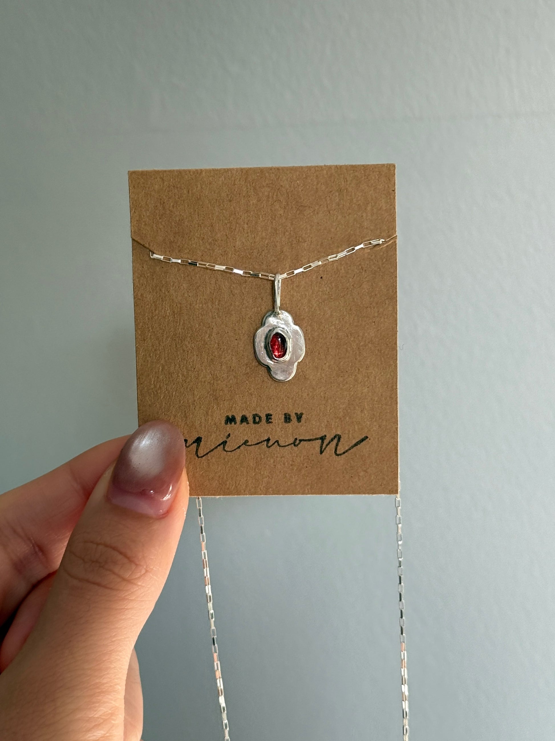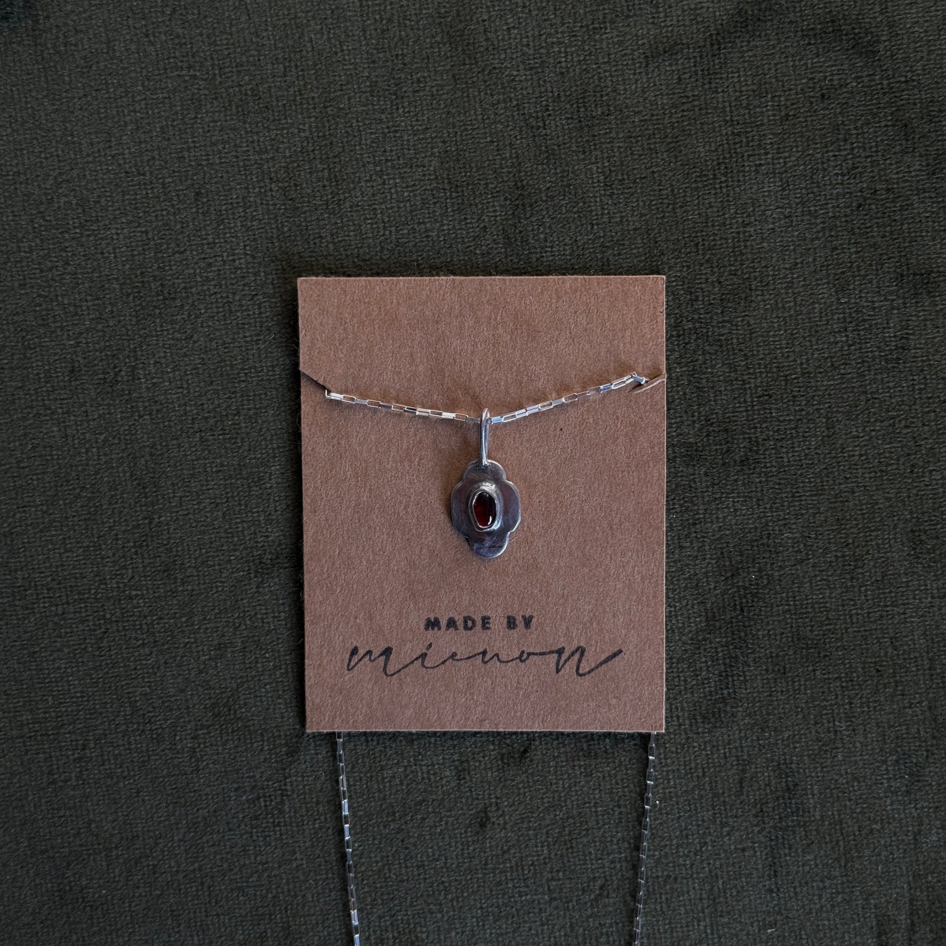 handcrafted sterling silver flower with garnet on a 18-19" chain.