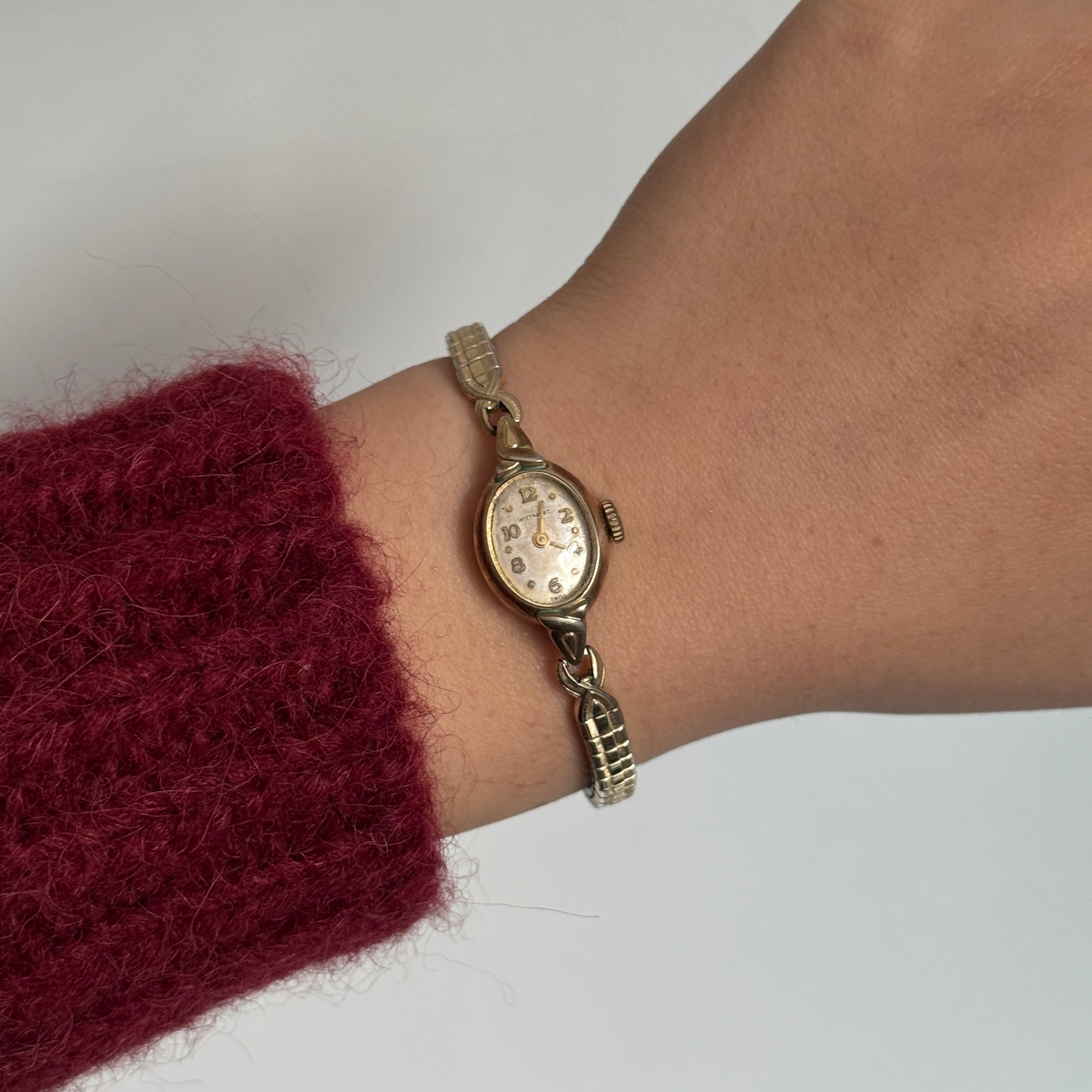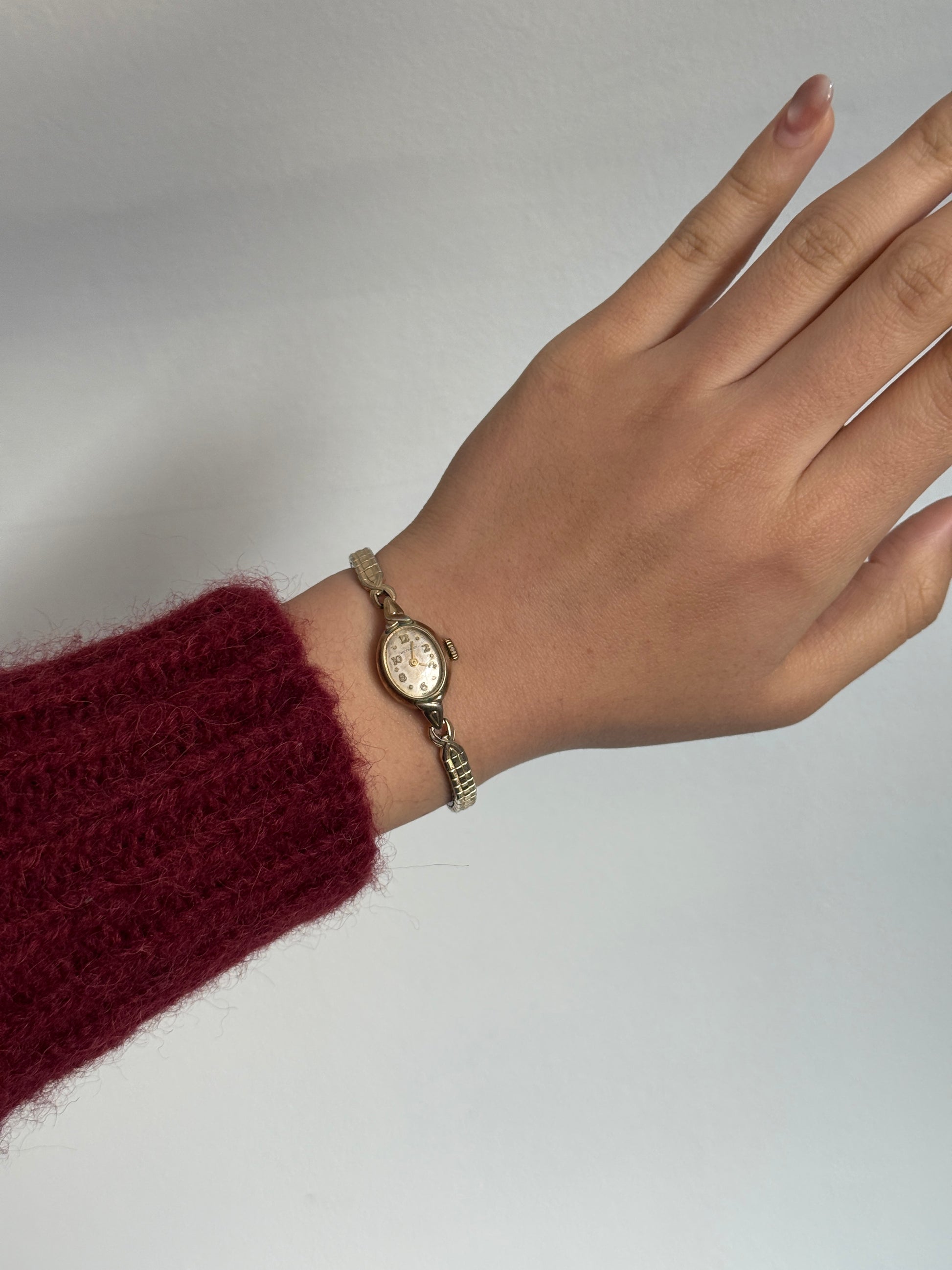 a dainty little gold wittnauer!! fits ~6-6.5", stretchy metal wristband