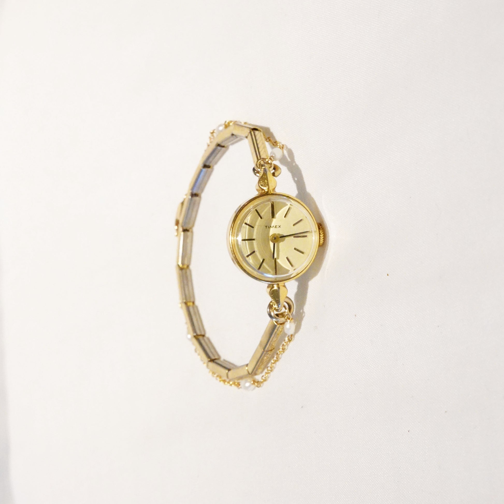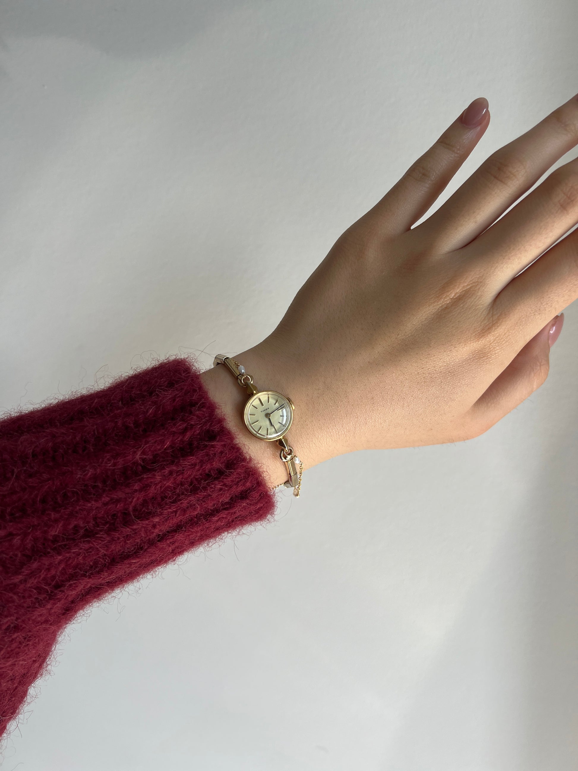 a pre-loved, vintage timex watch paired with one of our 14k gold-fill freshwater pearl bracelets.