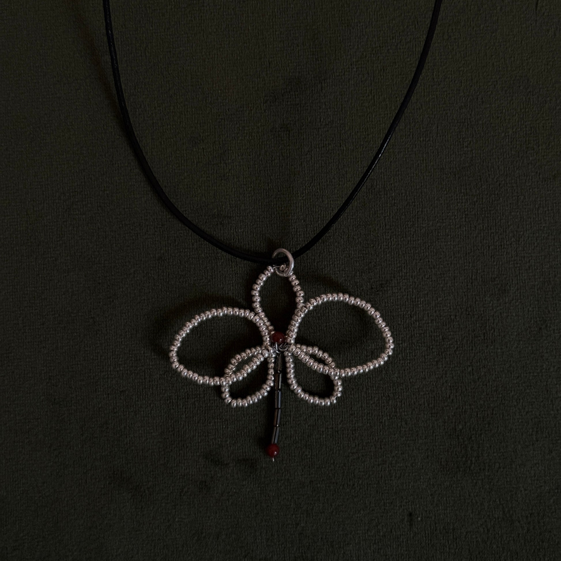 hand beaded orchid pendant on leather cord with sterling silver hardware, 19".