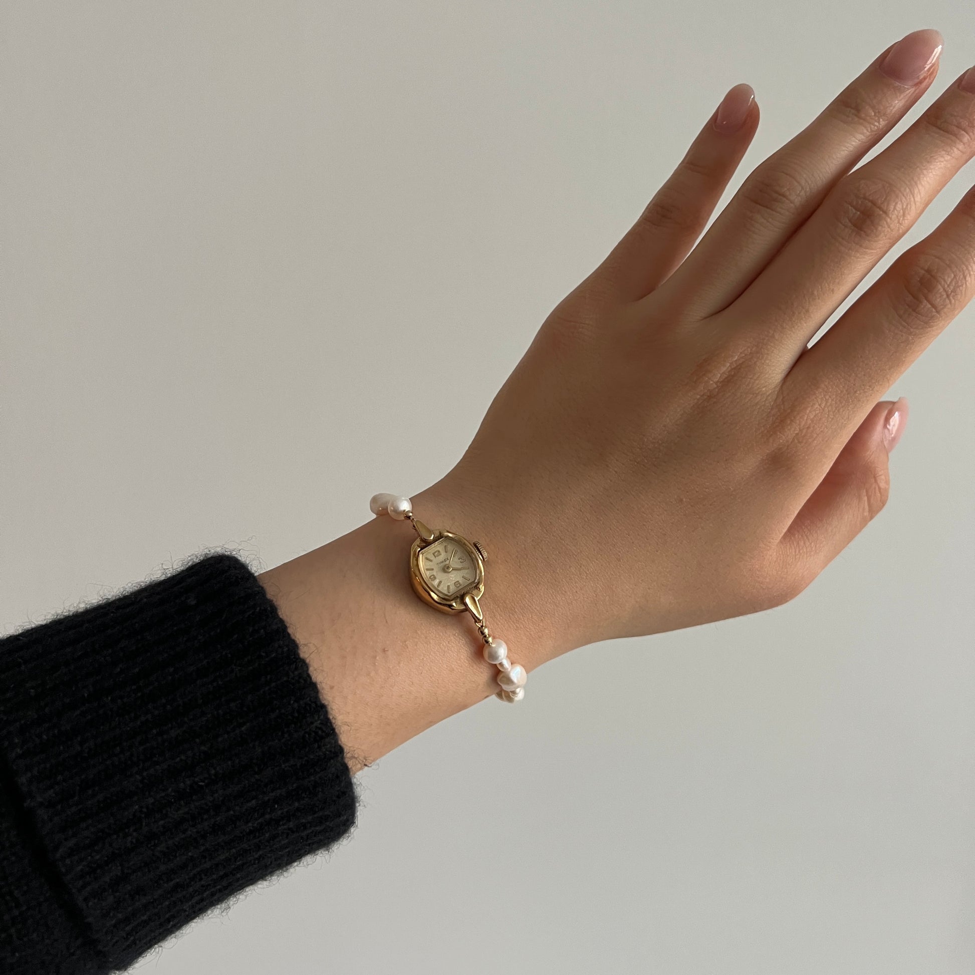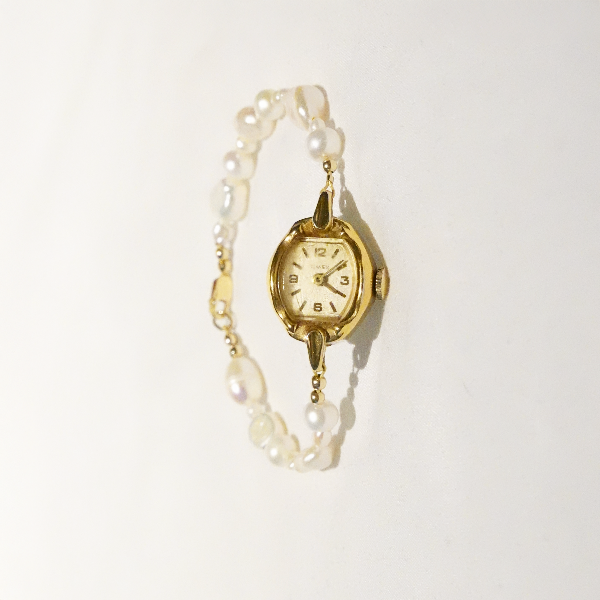 a pre-loved, vintage timex watch face with a freshwater pearl bracelet <3